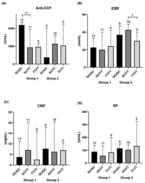 Comparison of diagnostic parameters across STAT4 haplotype combinations. Each bar represents a haplotype combination (GC/GC, GC/TT, TT/TT). (A) Serum anti-CCP levels were significantly higher in the GC/GC haplotype combination within the remission-low activity group compared to GC/TT (p < 0.01). No significant differences were observed among haplotype combinations in the moderate-high activity group. (B) ESR was significantly higher in the GC/TT haplotype combination compared with TT/TT in the moderate-high activity group (p < 0.05). (C) CRP and (D) RF showed no significant differences among haplotype combinations. Statistical comparisons were performed using the Kruskal–Wallis nonparametric test with Dunn’s post hoc comparison. Numbers above bars indicate the number of patients per haplotype in each group. ** Significance value < 0.01; * Significance value < 0.05.