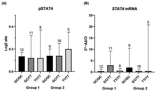 Comparison of STAT4 protein and gene expression across STAT4 haplotype combinations. Each bar represents a haplotype combination (GC/GC, GC/TT, TT/TT). (A) Expression levels of phosphorylated STAT4 (pSTAT4) and (B) STAT4 mRNA expression showed no significant differences among haplotype combinations in either the remission-low activity group or the moderate-high activity group. Basal pSTAT4 measurements were performed in non-stimulated PBMCs from patients receiving conventional DMARD therapy, which may influence basal phosphorylation and should be considered when interpreting these results. Statistical comparisons were performed using the Kruskal–Wallis nonparametric test with Dunn’s post hoc comparison. Numbers above bars indicate the number of patients per haplotype in each group.