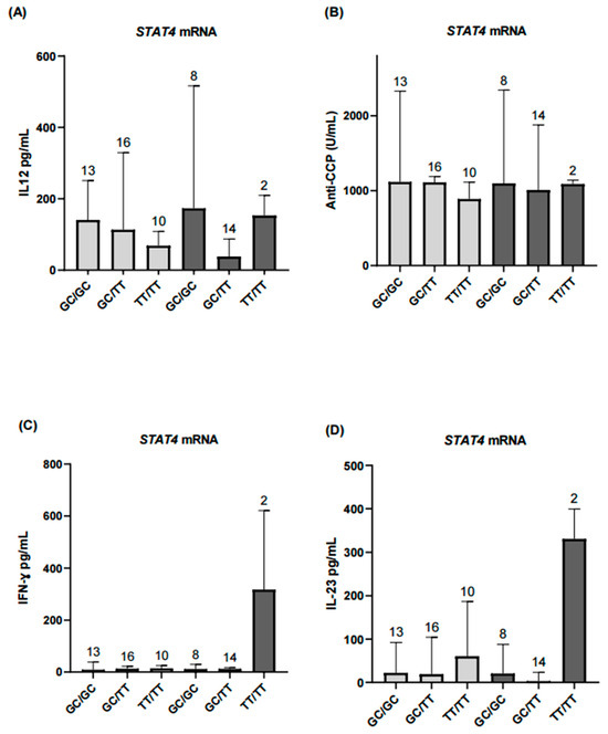Comparison of inflammatory biomarkers according to STAT4 mRNA expression levels. (A) Serum IL-12 levels showed no significant differences in the STAT4 underexpression group (p > 0.05). (B,C) Anti-CCP antibody and IFN-γ levels were comparable in the underexpression group and did not reach statistical significance. (D) IL-23 levels showed no significant differences in the underexpression group. Light gray bars represent patients with STAT4 underexpression, and dark gray bars represent patients with STAT4 overexpression. Results for the overexpression group across all analyzed markers are presented descriptively and should be interpreted with caution due to the small sample size. Numbers above bars indicate the number of patients per haplotype in each group.