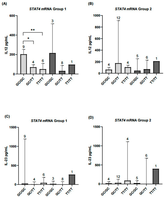 Comparison of serum IL-12 and IL-23 levels according to STAT4 haplotypes and mRNA expression levels in rheumatoid arthritis patients with different disease activity. (A,B) In the remission–low activity group (Group 1), patients with STAT4 underexpression and the GC/GC haplotype had significantly higher IL-12 levels compared with those carrying GC/TT (p < 0.05) or TT/TT (p < 0.01). In contrast, in the moderate–high activity group (Group 2), results for patients with STAT4 overexpression are shown descriptively only and were not included in the statistical analyses. (C,D) For IL-23, patients with STAT4 underexpression did not show significant differences between haplotypes (p = 0.07). Results from the STAT4 overexpression subgroup in both activity groups are presented descriptively only. Numbers above bars indicate the number of patients per haplotype in each group. ** Significance value < 0.01; * Significance value < 0.05.
