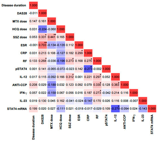 In addition, RF was positively correlated with IL-12 (r = 0.30, p < 0.05), anti-CCP antibodies (r = 0.33, p < 0.05), and IFN-γ (r = 0.27, p < 0.05). IL-12 was also positively correlated with RF (r = 0.30, p < 0.05) and anti-CCP (r = 0.38, p < 0.05). Finally, IL-12 showed a negative correlation with STAT4 mRNA expression (r = −0.28, p < 0.05) and a positive correlation with anti-CCP (r = 0.38, p < 0.05) (Figure 8).