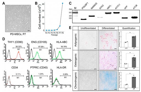 To confirm the PD-MSC characteristics, we analyzed the morphology and proliferation capacity of PD-MSCs. PD-MSCs exhibited an elongated, spindle-shaped morphology and kept growing after passaging (Figure 1A,B). The analysis of stemness markers and the expressions of three germ lineages of PD-MSCs was performed using end-point RT-PCR. These cells expressed self-renewal markers such as POU5F1 (Oct4), NANOG, and SOX2, indicating their capacity for self-regeneration. Furthermore, germ lineage-specific markers, including NEFL, ACTC1, and AFP, were expressed, confirming the characterization of these MSCs (Figure 1C). Isolated PD-MSCs displayed typical MSC phenotypes, expressing markers such as THY1 (CD90), ENG (CD105), HLA-ABC, and lacking CD34, PTPRC (CD45), HLA-DR (Figure 1D). The differentiation capabilities of PD-MSCs across adipogenic, osteogenic, and chondrogenic lineages were confirmed using specific staining methods, including Oil-Red O for adipogenesis, von Kossa staining for osteogenesis, and alcian blue staining for chondrogenesis (Figure 1E).