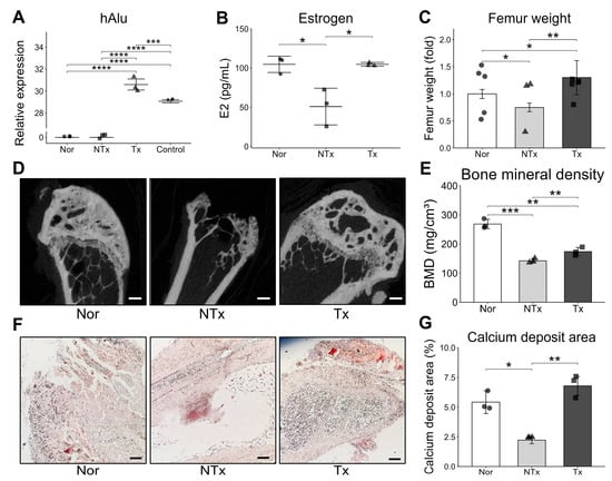 To verify the engraftment capability of the cells in vivo, the mRNA expression of the human-specific Alu sequence (hAlu) was examined to quantitatively evaluate the presence of engrafted human cells (Figure 2A). The femur subjected to ovariectomy (OVX) showed notably high expression of hAlu in the Tx group. In contrast, the NTx group did not exhibit significant hAlu expression. Overall, the observed levels of hAlu expression strongly indicate the successful engraftment of PD-MSCs in the femur, a long bone, in vivo, despite being transplanted via tail vein injection.