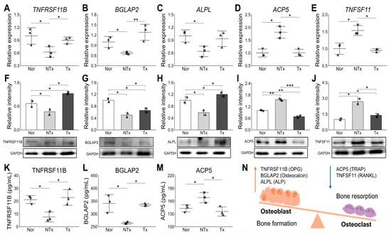 The intricate regulation of bone remodeling involves a dynamic interplay between bone-forming osteoblasts and bone-resorbing osteoclasts. Osteoblasts and osteoclasts communicate to modulate cellular behavior, survival, and differentiation, either through direct cell-to-cell contact or by secreting proteins. To investigate the impact of PD-MSCs on the homeostasis between osteoblasts and osteoclasts, we evaluated specific markers for each cell type. Osteoblast markers, including TNFRSF11B, BGLAP2, and ALPL, associated with bone formation, exhibited a significant decrease in the NTx group at both mRNA (Figure 3A–C) and protein levels (Figure 3F–H), while an increase was observed in the Tx group. Conversely, osteoclast-specific markers ACP5 and TNFSF11 (receptor activator of nuclear factor kappa-Β ligand, RANKL) demonstrated increased patterns in the NTx group but decreased in the Tx group at both mRNA (Figure 3D,E) and protein levels (Figure 3I,J). The levels of TNFRSF11B (OPG) and BGLAP2 (Osteocalcin) in serum, indicative of bone formation, were elevated following the transplantation of PD-MSCs (Figure 3K,L). In contrast, the expression levels of ACP5 (TRAP) in serum, representing bone resorption, decreased in the Tx group (Figure 3M). These collective findings suggest that PD-MSCs treatment can balance bone formation by enhancing osteoblast function and diminishing osteoclast function, thereby providing therapeutic effects for osteoporosis (Figure 3N).