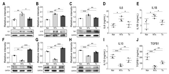 We conducted a protein analysis and blood chemistry analysis to verify the inflammatory response after PD-MSC injection. The results revealed a significant decrease in pro-inflammatory factors such as IL6, IL1B and TNF in the Tx group compared to the NTx group, while an increase was observed in the NTx group compared to the normal group (Figure 4A–E). Conversely, the anti-inflammatory factors IL10, TGFB1, and CD163 exhibited a significant increase in the Tx group compared to the NTx group (Figure 4F–J). These findings suggest that the engrafted PD-MSCs at the injured bone tissue site, through transplantation, effectively alleviates the inflammatory response in the OVX mouse model.