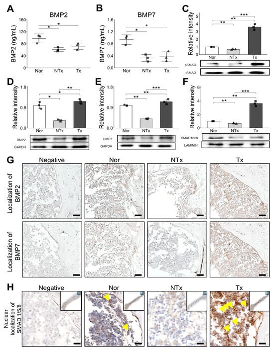 Bone morphogenic protein (BMP) and SMAD expressions in OVX mice and PD-MSC transplanted mice. (A) Bone morphogenic protein 2 (BMP2) and (B) Bone morphogenic protein 7 (BMP7) level analyzed by ELISA in mice serum. (C) Phosphorylated SMAD1/5/8 protein expression was analyzed by Western blot. (D) Bone morphogenic protein 2 (BMP2) and (E) Bone morphogenic protein 7 (BMP7) protein expressions were analyzed by Western blot. (F) SMAD protein expression in nucleus was analyzed by Western blot. (G) Representative images showing Bone morphogenic protein 2 (BMP2) and Bone morphogenic protein 7 (BMP7) expression in trabecular bone regions. Positive staining was primarily observed in osteoblasts and osteocytes lining the trabecular surface. Scale bar: 100 μm. (H) High-magnification images showing nuclear localization of SMAD1/5/8 (yellow arrows) in osteoblasts and osteocytes. PD-MSC transplantation (Tx) markedly restored Bone morphogenic protein 2,7 (BMP2,7) expression and SMAD1/5/8 activation compared with the OVX untreated group (NTx). Scale bar: 50 μm. Data are shown as mean ± SD. For comparisons involving more than two groups, the Kruskal–Wallis H test was used, followed by the Conover-Iman post hoc test for pairwise comparisons when significant (p < 0.05). The Benjamini–Hochberg correction adjusted for multiple testing. A p-value < 0.05 was considered significant, * p < 0.05; ** p < 0.01; *** p < 0.001.