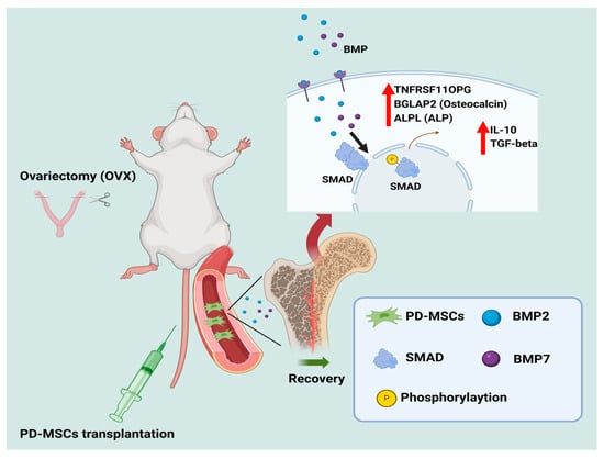 Postmenopausal osteoporosis, which arises from estrogen deficiency, lead to reduced bone mass and increased fracture risk []. While traditional treatments like estrogen replacement and bisphosphonates are effective, they carry significant risks []. However, PD-MSC therapy offers a promising alternative with fewer side effects []. Previous study has shown that PD-MSCs contribute to bone repair by secreting bioactive molecules, such as Bone morphogenic protein (BMP), TGF-β, and VEGF, which support osteogenesis []. According to research by Janet L. Crane, Xu Cao, and colleagues, mesenchymal stem cells particularly help restore Bone morphogenic protein (BMP)-SMAD signaling, crucial for bone metabolism [].