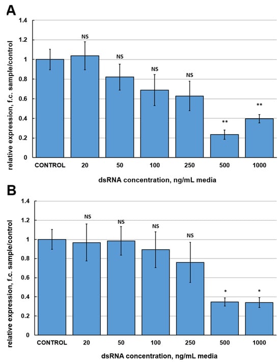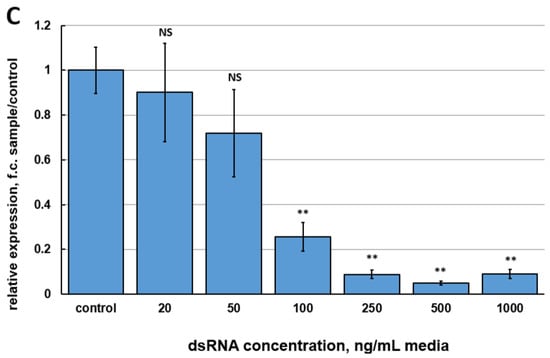 Relative expression levels of the FgVe1 gene (fold changes, f.c.) in liquid cultures of F. graminearum MFG 58918, treated with different concentrations (20, 50, 100, 250, 500, and 1000 ng/mL of media) of three candidate dsRNAs: FgVe1_150 (A), FgVe1_370 (B), FgVe1_540 (C). The experiment was carried out in four biological replicates with two technical replications for each sample. The FgVe1 expression level for the control was considered as 1.0. The Tef1α gene was used as a reference. Bars represent mean ± SD (n = 4). Symbols indicate the significance levels of differences according to the Tukey HSD test: ** p < 0.01; * p < 0.05; NS—no significant difference.