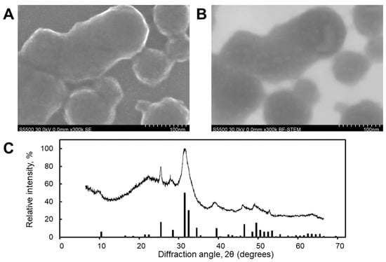 SEM (A) and STEM (B) images and X-ray diffractogram (C) of CaPs. The bars present the peaks assigned to the characteristic spectrum of hexagonal hydroxyapatite.