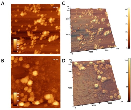 Atomic force microscopy (AFM) showed that the CaPs were predominantly spherical (Figure 3A,C). Particles were not prone to destruction when exposed to a cantilever and were quite elastic and did not aggregate; when drying on graphite or mica, they tend to form a monolayer, but a double layer can also be seen. The typical diameter was 35 ± 7 nm. AFM showed a lower diameter than SEM due to adsorption on the substrate while drying, and due to the form of the cantilever.