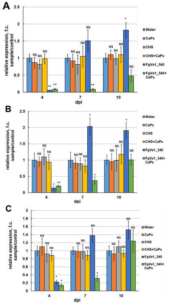 Effect of FgVe1_540 dsRNA (75 ng/μL) and CaPs:FgVe1_540 dsRNA nanocomplexes (375:75 ng/μL) treatment on the relative expression of the FgVe1 (A) and Tri5 (B) genes in detached wheat leaves. Analyses were carried out at 7 and 14 dpi. Control treatments included (i) sterile water (expression levels of target genes in these samples were considered as 1.0); (ii) CaPs suspension (375 ng/μL); (iii) ChS dsRNA (75 ng/μL); (iv) CaPs:ChS dsRNA nanocomplex (375: 75 ng/μL). The experiment was carried out in three biological replicates. The FgVe1 expression level in the control (untreated) leaves was considered as 1.0. The Tef1α gene was used as a reference. Bars represent mean ± SD (n = 3). Symbols indicate the significance levels of differences according to the Tukey HSD test: * p < 0.05; NS—no significant difference.