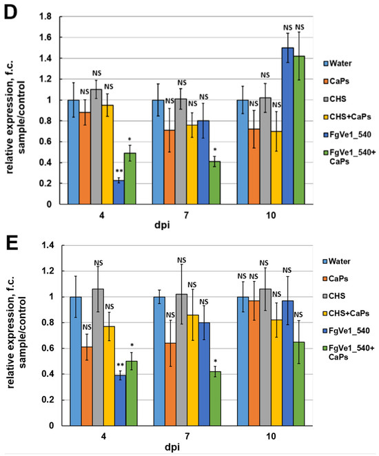 Effect of FgVe1_540 dsRNA (12.5 ng/mL) and CaPs:FgVe1_540 (62.5: 12.5 ng/mL) dsRNA nanocomplexes treatment on the relative expression of the FgVe1 (A) and four genes related to fungal secondary metabolism: Tri5 (B), Tri6 (C), Pks12 (D), AurR1 (E), in liquid cultures of F. graminearum MFG 58918. Analyses were carried out at 4, 7, and 10 dpi. Control treatments included (i) sterile water (expression levels of target genes in these samples were considered as 1.0); (ii) CaPs suspension (62.5 ng/μL); (iii) ChS dsRNA (12.5 ng/μL); (iv) CaPs:ChS dsRNA nanocomplex (62.5: 12.5 ng/μL). The experiment was carried out in four biological replicates with two technical replications for each sample. The FgVe1 expression level for the control was considered as 1.0. The Tef1α gene was used as a reference. Bars represent mean ± SD (n = 4). Symbols indicate the significance levels of differences according to the Tukey HSD test: ** p < 0.01; * p < 0.05; NS—no significant difference.