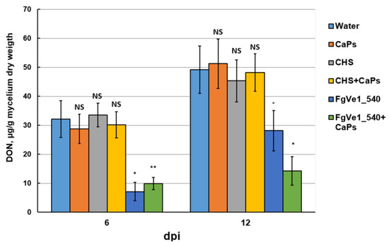 Effect of FgVe1_540 dsRNA and CaPs:FgVe1_540 dsRNA nanocomplexes treatment on DON accumulation in liquid cultures of F. graminearum MFG 58918. DON content is expressed as µg per g of mycelium dry weight. Bars represent mean ± SD (n = 4). Symbols indicate the significance levels of differences according to the Tukey HSD test: ** p < 0.01; * p < 0.05; NS—no significant difference.