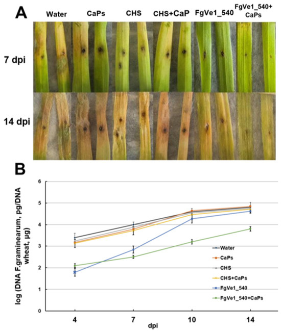 Effect of FgVe1_540 dsRNA and CaPs:FgVe1_540 dsRNA nanocomplexes treatment on F. graminearum MFG 58918 growth on detached wheat leaves. Photographs were taken at 7 and 14 dpi (A). Dynamics of F. graminearum MFG 58918 growth in treated and control detached wheat leaves expressed as log10 (fungal DNA, pg/wheat DNA, µg). Analyses were carried out at 4, 7, 10, and 14 dpi (B).