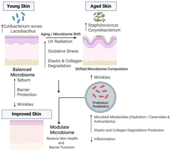 Impact of the Skin Microbiome on Wrinkle Formation and Potential Modulation During Aging. The upper left side represents microbial features of young and healthy skin, which is characterized by higher abundance of Cutibacterium acnes and Lactobacillus species. These microbes support skin health by producing short-chain fatty acids, maintaining sebum production, and strengthening barrier integrity, which collectively reduce wrinkle formation. In contrast, the upper right side shows aged skin, where an increased abundance of Staphylococcus and Corynebacterium species contributes to inflammation, oxidative stress, and extracellular matrix (ECM) degradation. These changes are driven by aging and environmental factors such as UV exposure. Probiotics and postbiotics can help modulate the aged microbiome by producing beneficial metabolites, enhancing skin hydration, increasing ceramide levels, and suppressing inflammation, ultimately restoring skin health and barrier function. Figure created with BioRender.com.