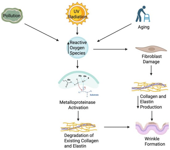 Emerging research indicates that the skin microbiome also influences elastin homeostasis. As indicated by Cheung et al., certain pro-inflammatory strains of Cutibacterium acnes and Staphylococcus epidermidis produce enzymes like proteases and elastases that can degrade the components of the extracellular matrix []. Conversely, Shirzad et al. explain commensals like Lactobacillus species may help to preserve the elastin integrity by inhibiting elastase activity []. An imbalance in the skin microbiome can thus accelerate elastin degradation, contributing to wrinkle formation. Moreover, UV radiation promotes the production of ROS, which upregulate MMPs and elastases, accelerating elastin degradation. This not only replaces healthy elastin fibers but also disrupts the surrounding ECM, further diminishing skin elasticity and contributing to coarse wrinkling and uneven skin texture []. UV-A radiation is a well-known inducer of ROS that can alter elastic fiber structure, thereby reducing skin elasticity and contributing to wrinkle formation and aging [,]. At the molecular level, the degradation of elastin reflects the interplay between intrinsic genetic programming and extrinsic environmental insults. Aging skin also experiences reduced fibroblast activity and dermal thinning, which together limit the skin’s capacity to repair and regenerate its elastic fiber network []. Clinical and experimental evidence indicates that wrinkle formation is significantly associated with UV-B-induced reduction in skin elasticity and structural modifications of elastic fibers. UV-B activates keratinocyte-derived cytokines that increase fibroblast elastase activity, which breaks down elastic fibers []. Elastase inhibition is crucial in preventing wrinkle formation, highlighting fibroblast elastase as a key mediator in the mechanism of UVB-induced wrinkle formation [].