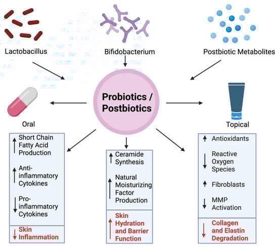 Probiotics, particularly strains such as Lactobacillus and Bifidobacterium, are recognized for their ability to modulate skin health through both the gut-skin and skin-skin axes. These microbes can be administered orally or applied topically, with each route offering distinct mechanisms for improving skin condition. Probiotics that are taken orally help to restore the gut microbiome, which can reduce systemic inflammation and oxidative stress, both of which contribute to dermal aging []. As highlighted in a study, strains like L. plantarum and B. breve have demonstrated the ability to boost anti-inflammatory cytokines such as IL-10 while downregulating pro-inflammatory markers like IL-6, leading to lower skin inflammation and improved elasticity []. Topical probiotics enhance the skin barrier and microbial diversity by promoting the colonization of beneficial microbes. This acts to outcompete harmful strains associated with aging [].