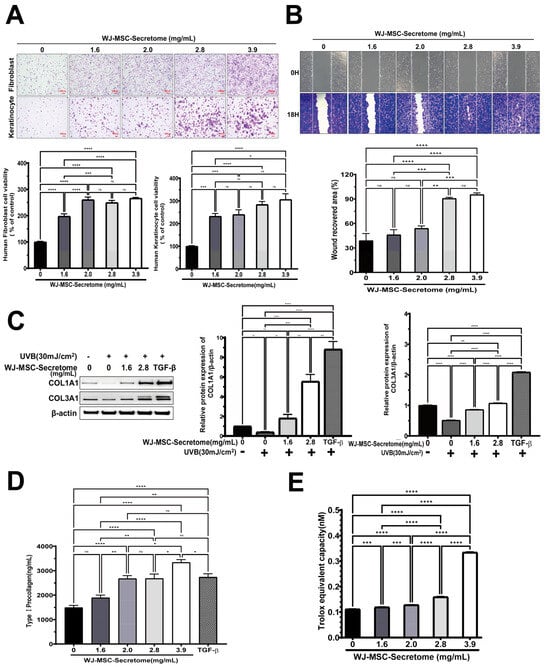 Effects of WJ-MSC secretome on skin cell function. (A) Proliferation of fibroblasts (HS68) and keratinocytes (HaCaT) treated with WJ-MSC secretome (0–3.9 mg/mL) for 24 h (n = 5 independent replicates per group). (B) Scratch wound healing of HaCaT cells after 18 h treatment with WJ-MSC secretome (n = 4 independent replicates per group). (C) UVB-irradiated fibroblasts (30 mJ/cm2) showing restored collagen (COL1A1180–200 kDa; COL3A1110/140 kDa) expression upon WJ-MSC secretome treatment. β-actin (43 kDa) was used as a loading control; uncropped blots are provided in Supplementary Figure S1. TGF-β served as a positive control (n = 3 independent experiments). (D) Type I procollagen secretion in fibroblasts following WJ-MSC secretome treatment (n = 5 independent replicates). (E) Antioxidant activity assessed by Trolox equivalent antioxidant capacity (TEAC) assay (n = 5 independent replicates). Data are presented as mean ± SEM. * p < 0.05, ** p < 0.01, *** p < 0.001, **** p < 0.0001.