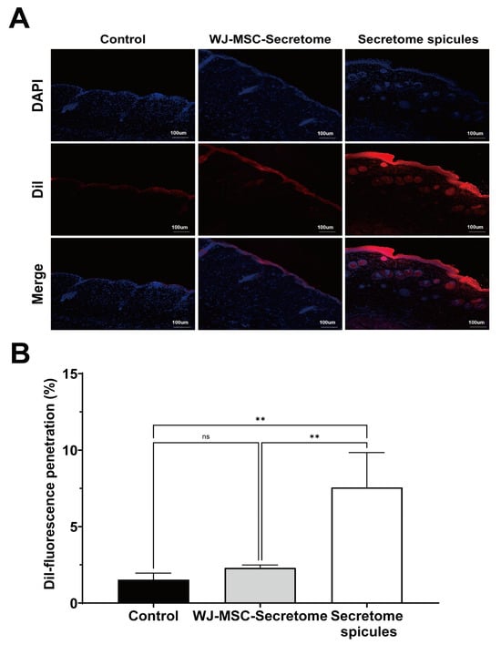 Skin penetration of secretome-coated spicules in mice. (A) Representative confocal images of dorsal skin sections collected 4 h after topical application of control (DiI), WJ-MSC secretome, or secretome-coated spicules. Nuclei were stained with DAPI (blue), and DiI-labeled secretome is shown in red. Scale bar = 100 μm. Dye-only controls were included to exclude false-positive DiI fluorescence signals (Supplementary Figure S2). (B) Quantification of DiI fluorescence penetration using ImageJ version 1.53t (n = 3 mice per group). Data are presented as mean ± SEM. Statistical analysis was performed by one-way ANOVA with Tukey’s multiple comparison test. ns = not significant, ** p < 0.01.