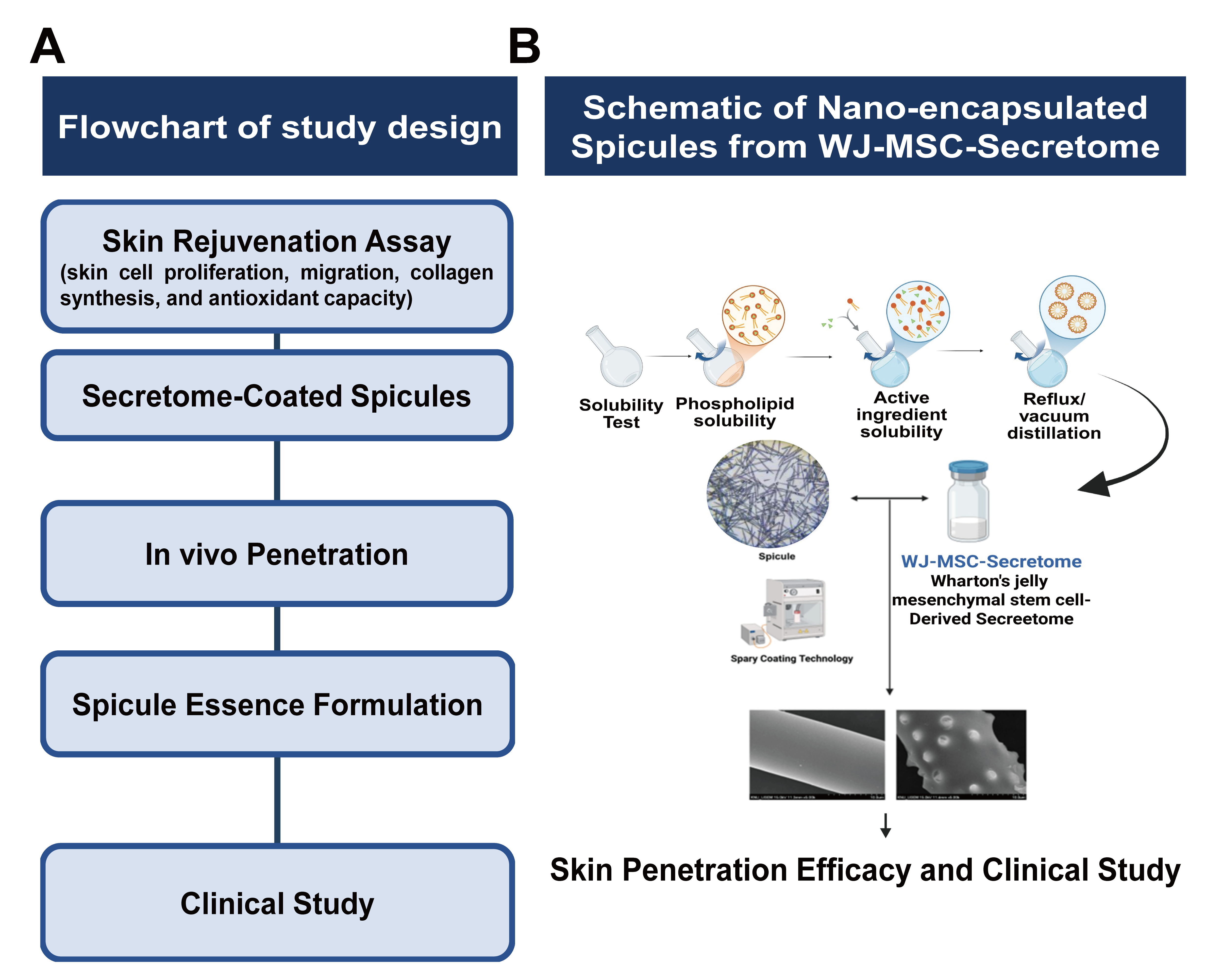 Based on this rationale, we hypothesized that combining MSC secretome with spicules could overcome the skin barrier and achieve clinically meaningful anti-aging effects. In the present study, we developed nano-coated spicules using Wharton’s jelly-derived MSC (WJ-MSC) secretome and marine sponge-derived spicules via spray-coating technology (SCT) [23,24]. We then evaluated their biological efficacy and dermal absorption in preclinical studies, followed by a single-arm clinical study evaluating improvements in absorption, pore characteristics, skin texture, wrinkles, and pigmentation.