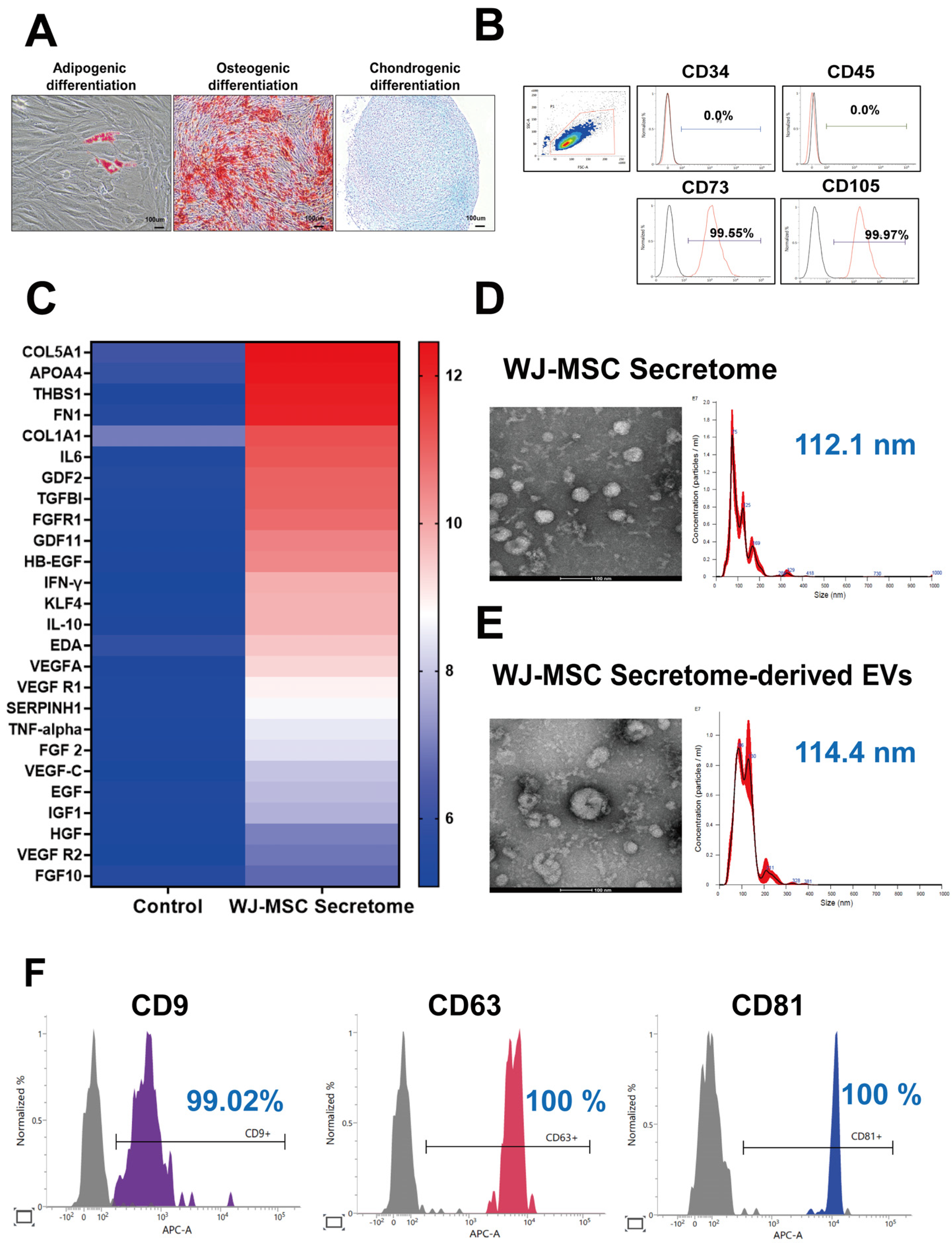 Figure 1. Characterization of WJ-MSCs, secretome, and extracellular vesicles (EVs). (A) Trilineage differentiation potential of WJ-MSCs into adipogenic, osteogenic, and chondrogenic lineages (representative images from n = 3 independent experiments). (B) Flow cytometry analysis showing positive expression of MSC markers (CD73, CD105) and negative expression of hematopoietic markers (CD34, CD45) (n = 3 independent runs). (C) Antibody array profiling of WJ-MSC secretome components. (D) Transmission electron microscopy (TEM) and nanoparticle tracking analysis (NTA) of WJ-MSC secretome (mean size 112.1 nm; concentration 9.15 × 1012 particles/mL; n = 2 independent isolations). (E) TEM and NTA of WJ-MSC secretome-derived EVs. EVs within the secretome were isolated using ExoDisc (LabSpinner, Ulsan, South Korea) (mean size 114.4 nm; concentration 8.74 × 1010 particles/mL; n = 2 independent isolations). (F) Surface marker expression (CD9, CD63, CD81) of secretome-derived EVs analyzed by MACSPlex (n = 2 biological replicates).