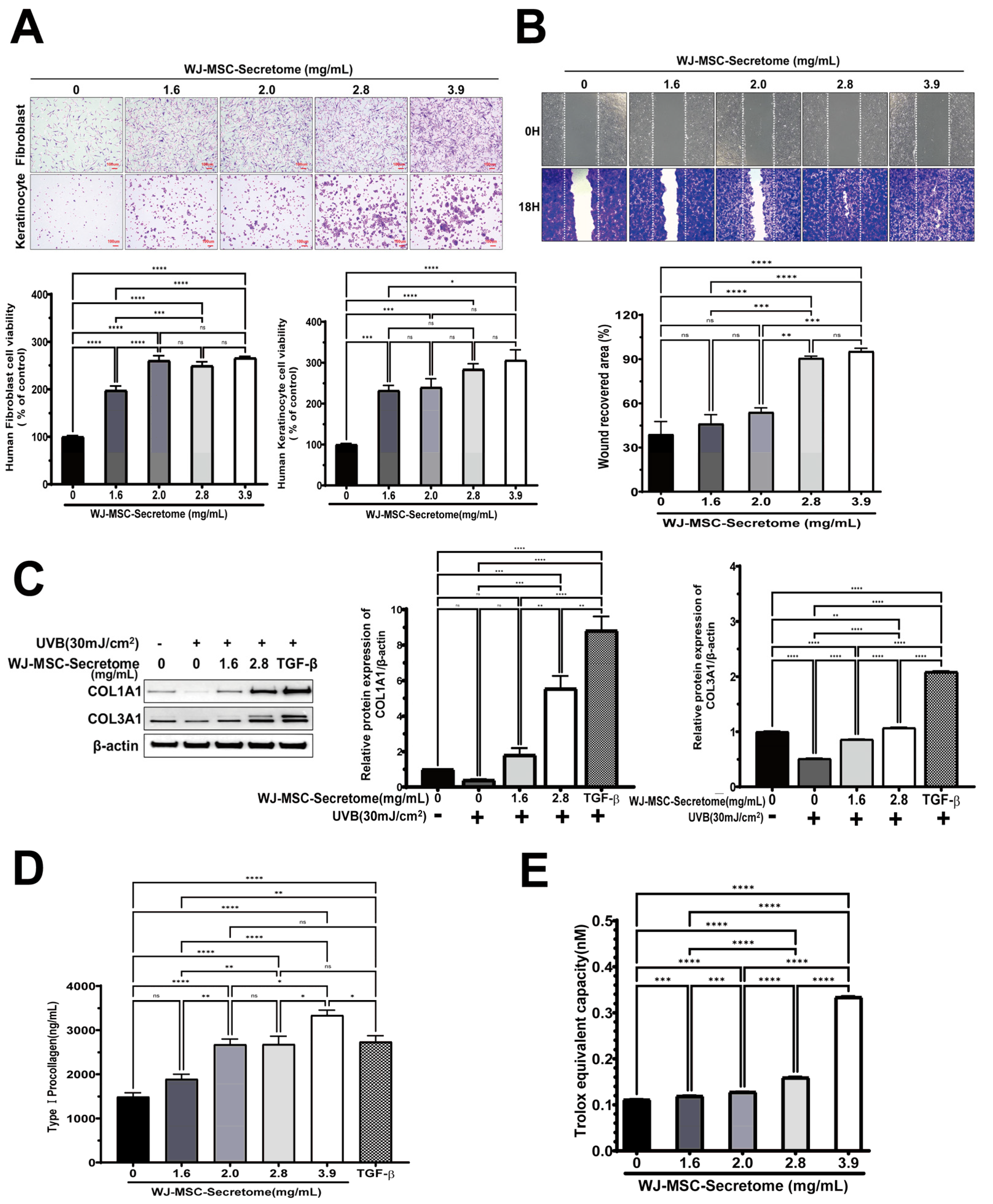 Figure 2. Effects of WJ-MSC secretome on skin cell function. (A) Proliferation of fibroblasts (HS68) and keratinocytes (HaCaT) treated with WJ-MSC secretome (0–3.9 mg/mL) for 24 h (n = 5 independent replicates per group). (B) Scratch wound healing of HaCaT cells after 18 h treatment with WJ-MSC secretome (n = 4 independent replicates per group). (C) UVB-irradiated fibroblasts (30 mJ/cm2) showing restored collagen (COL1A1180–200 kDa; COL3A1110/140 kDa) expression upon WJ-MSC secretome treatment. β-actin (43 kDa) was used as a loading control; uncropped blots are provided in Supplementary Figure S1. TGF-β served as a positive control (n = 3 independent experiments). (D) Type I procollagen secretion in fibroblasts following WJ-MSC secretome treatment (n = 5 independent replicates). (E) Antioxidant activity assessed by Trolox equivalent antioxidant capacity (TEAC) assay (n = 5 independent replicates). Data are presented as mean ± SEM. * p < 0.05, ** p < 0.01, *** p < 0.001, **** p < 0.0001.