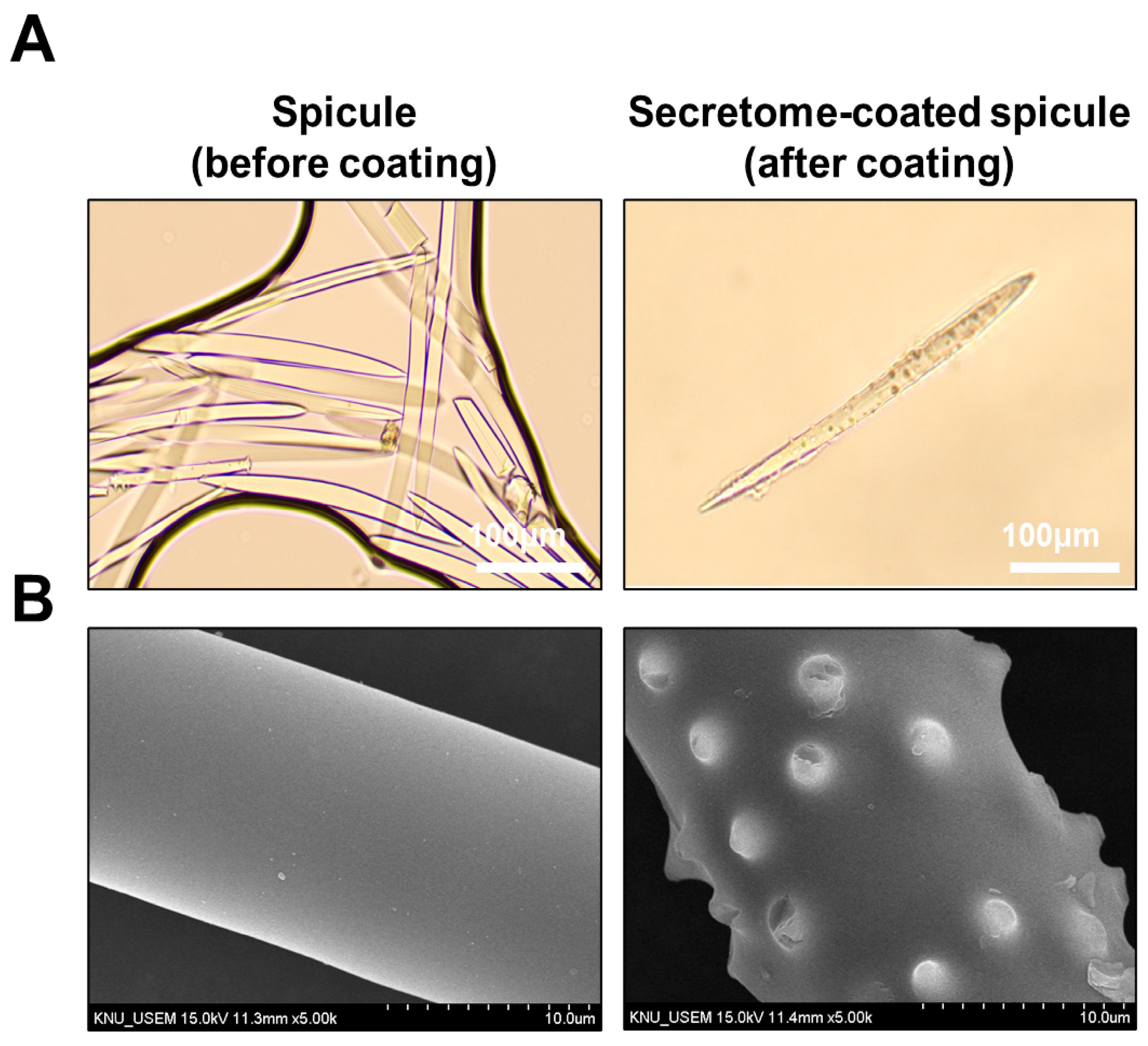 Figure 3. Morphological characterization of spicules with or without WJ-MSC secretome coating. (A) Bright-field images of uncoated (left) and secretome-coated (right) spicules (scale bar = 100 μm). (B) SEM images showing a smooth uncoated surface (left) and deposition of secretome-derived nano-deposits on coated spicules (right) (scale bar = 10 μm).