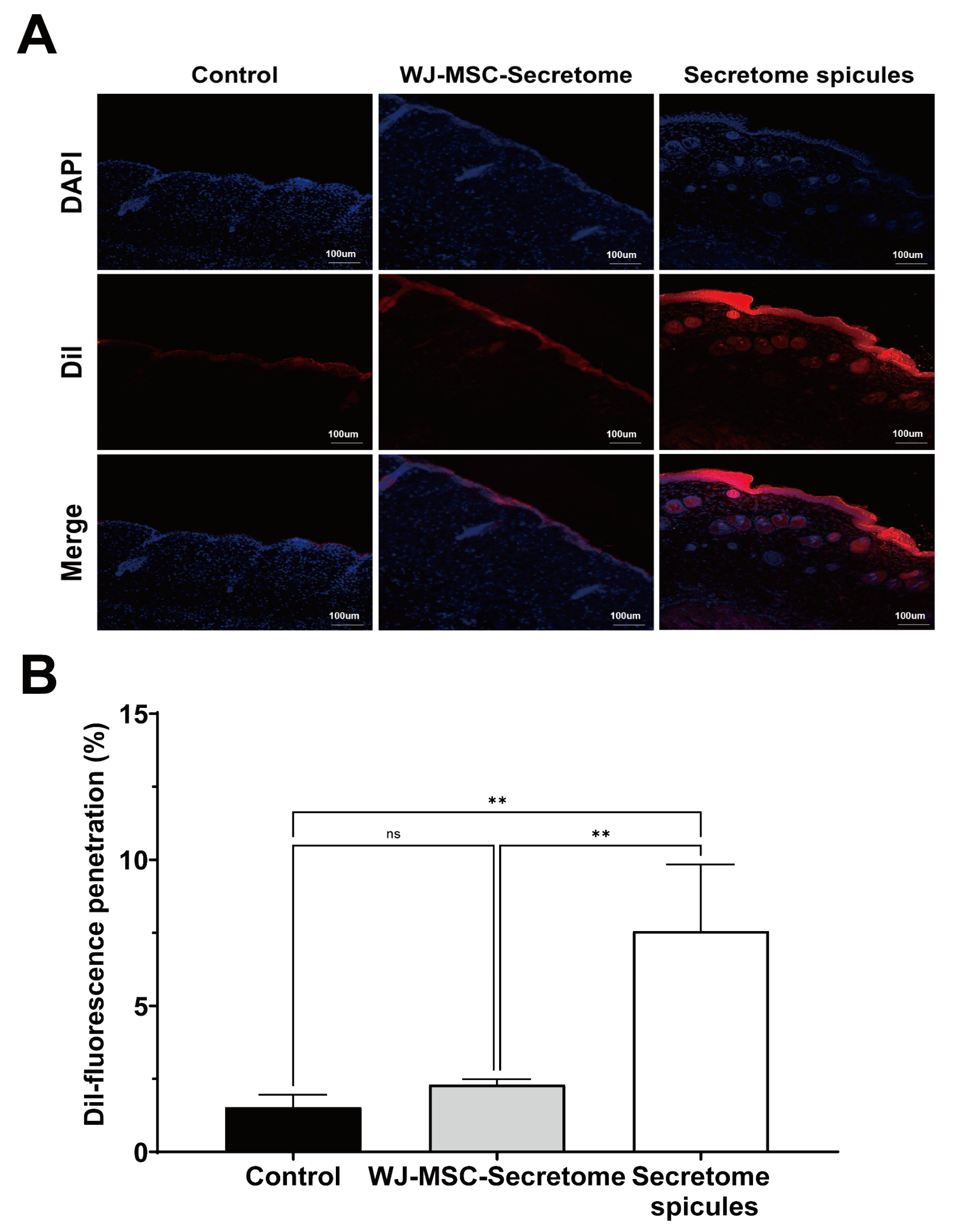 Figure 4. Skin penetration of secretome-coated spicules in mice. (A) Representative confocal images of dorsal skin sections collected 4 h after topical application of control (DiI), WJ-MSC secretome, or secretome-coated spicules. Nuclei were stained with DAPI (blue), and DiI-labeled secretome is shown in red. Scale bar = 100 μm. Dye-only controls were included to exclude false-positive DiI fluorescence signals (Supplementary Figure S2). (B) Quantification of DiI fluorescence penetration using ImageJ version 1.53t (n = 3 mice per group). Data are presented as mean ± SEM. Statistical analysis was performed by one-way ANOVA with Tukey’s multiple comparison test. ns = not significant, ** p < 0.01.