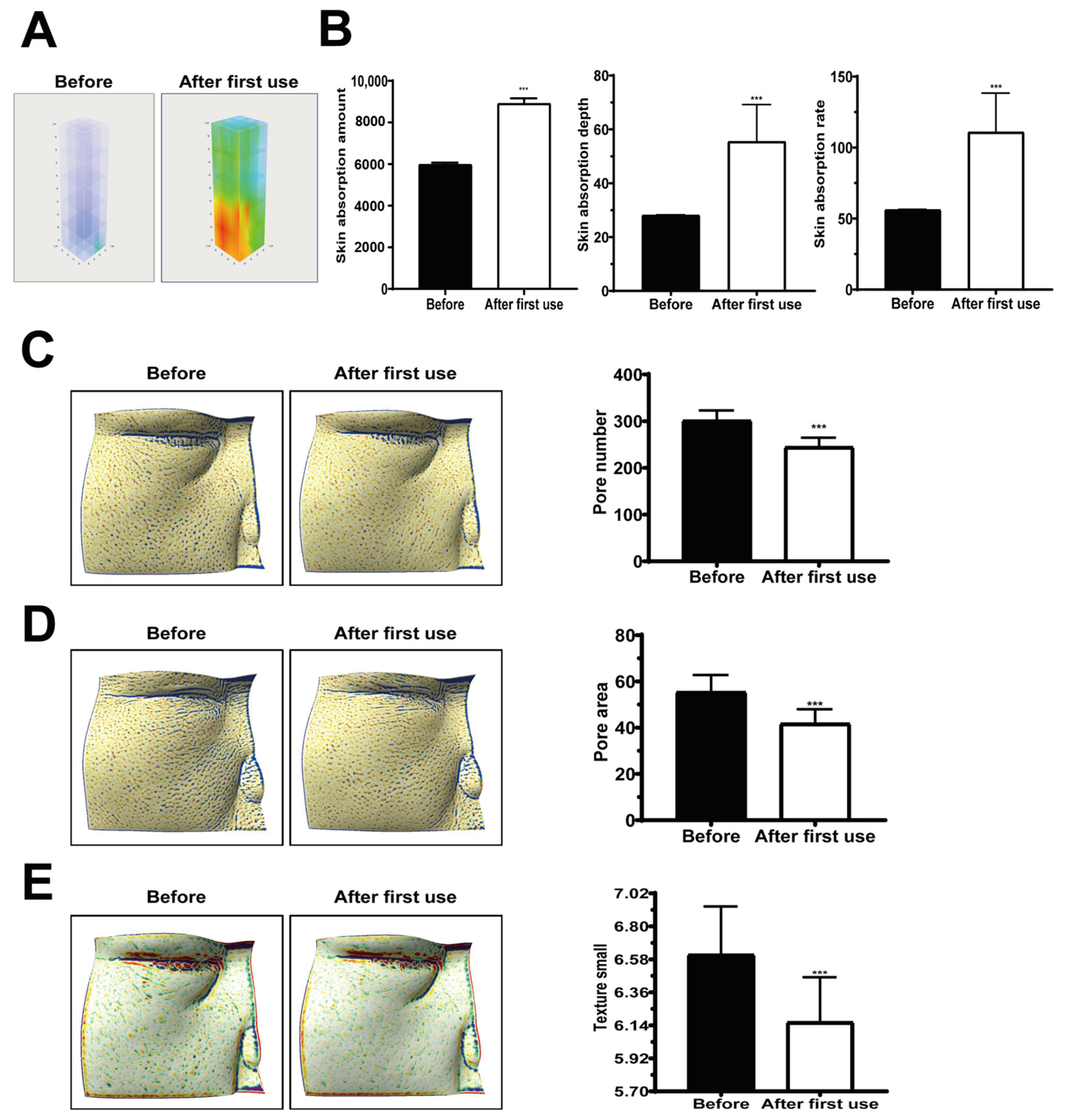 Skin surface analysis showed a significant reduction in pore number and pore area immediately after the first application (Figure 5C, D; p < 0.001). The skin texture index also improved, indicating a smoother surface (Figure 5E; p < 0.001).