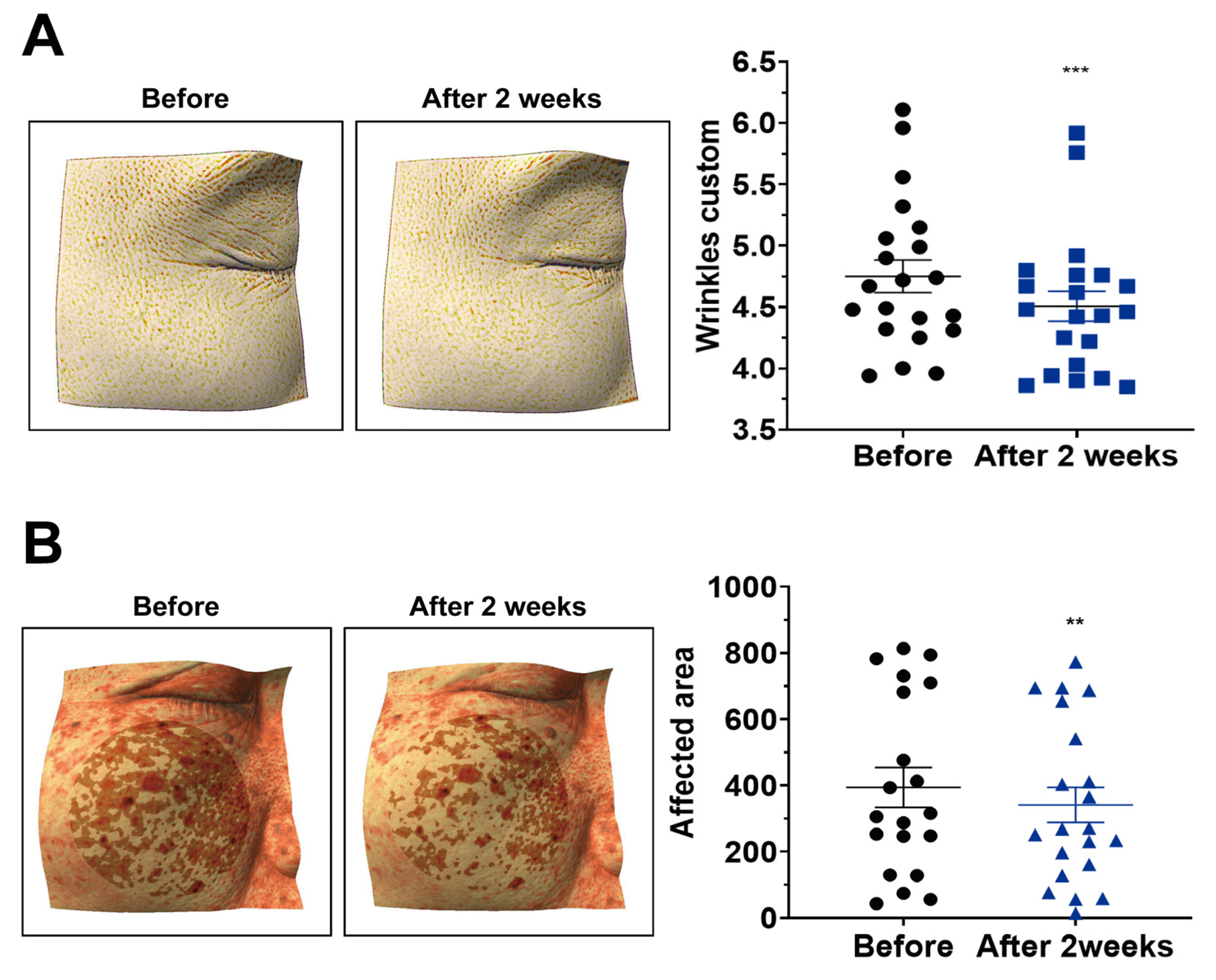 Figure 6. Reduction in wrinkles and pigmentation after two weeks of treatment with nano-coated spicule essence. (A) Wrinkle index after two weeks of treatment. (B) Pigmented area after two weeks of treatment. Data are presented as mean ± SEM (n = 21 participants). The horizontal lines in the scatter plots represent the mean ± SEM. Absolute values for wrinkle index and pigmented area are provided in Supplementary Tables S1 and S2. Statistical analyses were performed using paired t-test or Wilcoxon signed-rank test, as appropriate (two-tailed); ** p < 0.01; *** p < 0.001.