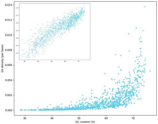 Density of G4 structures across bacterial genomes with varying GC content. Each point represents a bacterial species. The main plot shows G4 density (number of G4s per base of reference genome length) plotted against genomic GC content. The embedded subplot in the upper left displays the same data with a logarithmic y-axis to better visualize variation in genomes with low G4 density and the exponential relationship between GC content and G4 density.