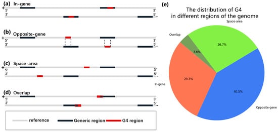 Four classifications of G4 defined based on different overlapping relationships between G4 and genomic annotations and their quantitative statistics. (a) In-gene G4s, entirely located within gene region. (b) Opposite-gene G4s, entirely located on the strand opposite to a gene region. (c) Space-area G4s, located within intergenic regions on both strands. (d) Overlapping G4s, spanning both gene and intergenic regions or their antisense counterparts. (e) The proportion of G4s from these four different regions in all G4 of the genome.