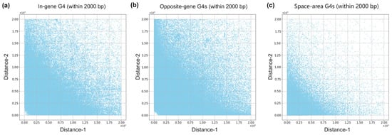 Spatial distribution of G4s relative to region boundaries in three genomic contexts. Three scatter plots depict the positions of individual G4s within (a) in-gene, (b) opposite-gene, and (c) space-area regions. For each G4, the horizontal axis (Distance 1) and vertical axis (Distance 2) represent its distance to the two boundaries of the region in which it is located. Only data points where both Distance 1 and Distance 2 are within 2000 bp are shown. “Distance 1” and “Distance 2” represent the distances from each G4 motif to the two boundaries of the genomic region in which it is located. Smaller values indicate G4s positioned closer to region boundaries, reflecting their potential clustering near gene starting or termini.