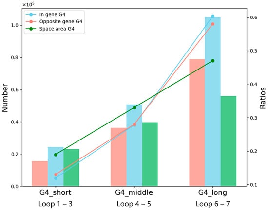 Loop length is another important determinant of G4 stability, and therefore we analyzed the distribution of loop-length categories in different genomic contexts, as shown in Figure 4. For G4s located in in-gene and opposite-gene regions, the proportions of short-loop, medium-loop, and long-loop G4s followed an approximately 2:4:5 ratio, indicating a balanced distribution. In contrast, G4s within intergenic (space-area) regions showed a markedly different profile (3:3:4). The major difference lays in the increased proportion of short-loop G4s, which are known to form more stable quadruplex structures and occur with lower probability under random nucleotide arrangements. The relative enrichment of short-loop G4s in intergenic regions therefore underscores their potential biological significance, suggesting that space-area G4s are selectively maintained and may serve as robust structural elements in gene regulation.
