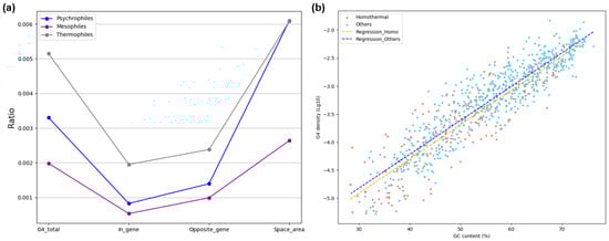 Environmental and genomic correlates of G4 density across bacterial groups. (a) G4 density in different genomic regions for psychrophilic, mesophilic, and thermophilic bacteria. Line plots compare the G4 density among psychrophilic, mesophilic, and thermophilic bacterial groups, illustrating variation in G4 abundance relative to optimal growth temperature. (b) Relationship between GC content and G4 density in bacteria from homothermic hosts and the others. Linear regression lines are fitted to each category to highlight trends in G4 density as a function of GC content.