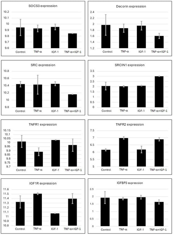 Analysis of gene expression from microarray database. Expression levels of select genes that mediate TNF-α- and IGF-1-induced pathways were assessed using GSE119651 microarray database. Figure shows expression levels of SOCS3, DCN, TNFR1, TNFR2, IGF1R, IGFBP3, SRC and SRCIN1 genes. Fold change in gene expression levels is represented on y-axis. Levels of gene expression with error bars representing standard error of mean from duplicate samples are shown. p-values could not be determined since data represents technical replicates.