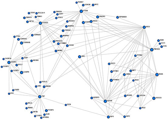 On the NetworkAnalyst webserver [,,], the option for “Gene list input” was selected and a list of the official gene symbols of 45 human genes that are involved in regulating TNF-α- and IGF-1-mediated signaling was uploaded as input data. The Generic Protein–Protein Interaction with First order build option was used, and the STRING interactome database set at 900 confidence score (allowable range is 400–1000, with 900 default option) was selected. This resulted in a subnetwork with 819 nodes and 45 seeds. Nodes such as the ones representing epigenetic gene regulators, apoptosis, and other quaternary connections showing different isoforms of various proteins that are remotely related to the pathways of interest were excluded.