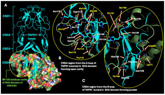 Protein–protein docking analysis was performed to evaluate the interaction between SOCS3 and TNFR1 (Figure 3A), as well as SOCS3 and TNFR2. Comparative analysis revealed that SOCS3 engages in more extensive polar contacts with TNFR1 than with TNFR2, suggesting a higher binding affinity toward TNFR1. Structural modeling demonstrated that the cysteine-rich domain 4 (CRD4) A-loop of TNFR1 inserts into the open cavity formed by flexible SH2-domain residues of SOCS3 (Figure 3B). In contrast, the B-loop of the TNFR1 CRD4 region becomes buried within an additional pocket shaped by the SH2 domain, N-terminal residues, and central β-sheet elements of SOCS3. Specific residues that participate in structural interactions were highlighted in Figure 3.