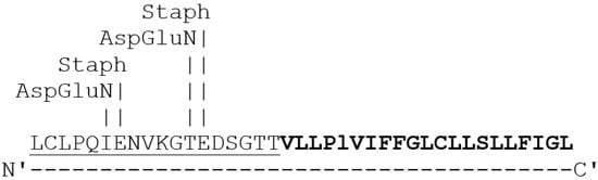 Protease cleavage sites on TNFR1: Sequence shown is in the ectodomain of TNFR1 receptor that is present N-terminal to the transmembrane domain. Sequence underlined is susceptible sequence for proteolytic cleavage by proteases from S. aureus (Staph) and Pseudomonas sps (AspGluN). Sequence highlighted in bold represents transmembrane domain of TNFR1.