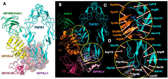 Importantly, as seen in Figure 5A, the formation of hybrid receptors between IGF1R and TNFR1 supports earlier reports which suggest that IGF1R forms hybrid receptors with thyrotropin and insulin receptors (IR) [,,,,,]. It was also reported that treatment with TNF-α leads to reduced sensitivity in trophoblast cells towards insulin and IGF-1 through formation of IGF1R and IR hybrid receptors []. The structural interaction between IGF1R and IR hybrid receptors (PDBs: 7S0Q, 7S8V) and also between IGF1R and thyrotropin receptors was previously reported. Our analysis of the heterotrimeric hybrid receptors agrees with the above reports. As shown in Figure 5A,B, we observed that IGF1R structurally interacts only with TNFR1. Herein, only the interacting region of IGF1R was shown. It is generally conceived that the ligand TNF-α exists in a homotrimer state. Receptor clustering of TNFR1 was speculated to be auto-induced and exist in a homotrimer state on the cell surface. Subsequently, the trimeric form of TNF-α interacts with the trimeric TNFR1 cell surface to initiate TNF-α-induced effects [,]. Based on our observations and above reports, we speculate that the hybrid receptors would exist in a heterotrimeric state. This may be required not only for receptor trimerization but also for structural stabilization on the cell surface. As seen in Figure 5, our molecular docking predicts the formation of heterotrimeric hybrid receptors as IGF1R:TNFR1:TNFR1. However, we do not exclude the existence or possibility of other polymeric assembly states in hybrid receptor formation, which needs to be determined through crystallographic studies.