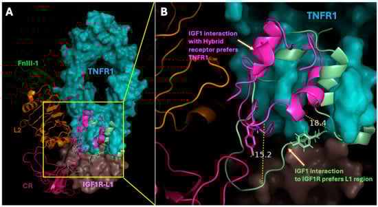 Structural insights into IGF-1 binding orientation within the IGF1R–TNFR1 hybrid receptor complex: (A) Overlay of IGF-1 (green ribbon) on L1 region (wheat tint) of IGF1R and IGF-1 (magenta ribbon) on CRD4 regions, loops A and B (cyan) of TNFR1. The region outlined with yellow line in panel (A) was detailed in panel (B). (B) Zoom view of showing overlay of IGF-1s, indicating spatial orientation of the IGF-1 on TNFR1 (cyan space) to that of IGF-1 (green ribbon) on IGF1R-L1 (wheat tint space). Figure was generated in PyMol 2.6.0 (Schrödinger) software.