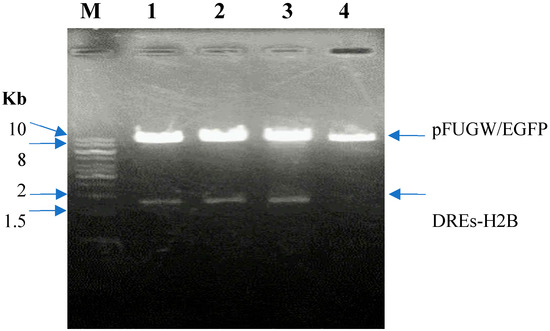 Lane M: 1 kb DNA ladder (Thermo Fisher Scientific, Waltham, MA, USA); Lane 1-3: Digested pFUGW/DREs-H2B-EGFP construct clone 1-3 with PacI and BamHI; 4: Digested pFUGW/EGFP with PacI and BamHI.