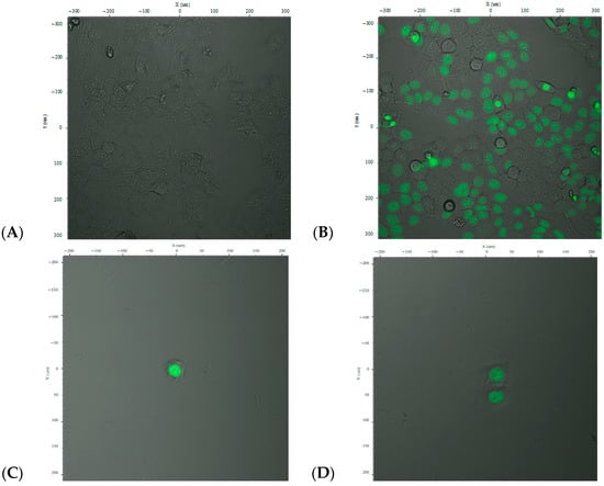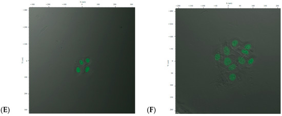 The resulting lentiviral particles carrying pFUGW/DREs-H2B-EGFP were used to transduce HepG2 cells using OptiMEM medium (Carlsbad, CA, USA). Post-transduction, the cells were stimulated with TCDD (2,3,7,8-tetrachlorodibenzo-p-dioxin) to assess inducible expression. Fluorescence microscopy images of the transduced cells at varying magnifications are presented in Figure 2A,B.