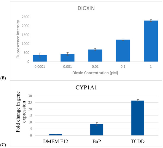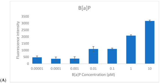 For B[a]P, a clear linear increase in fluorescence intensity was observed within the concentration range of 0.1–10 pM, indicating effective dose-dependent activation of the AhR pathway. The estimated limit of detection (LOD) for B[a]P was approximately 0.1 pM, based on the lowest concentration at which consistent fluorescence induction was recorded.