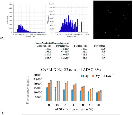 (A) ADSC-derived EVs and (B) GFP fluorescence intensity of CAFLUX HepG2/DREs-H2B-EGFP cells in response to ADSC-derived EVs.