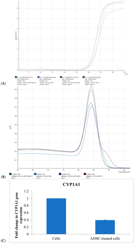 The amplification plot demonstrated a delayed fluorescence signal in EV-treated cells compared to untreated controls, indicating a lower level of CYP1A1 transcript. Melt curve analysis revealed a single specific peak at approximately 84 °C, confirming the specificity of the amplification. Untreated CAFLUX HepG2 control cells exhibited a lower Ct value, with a ΔΔCt for CYP1A1 of 1.409 ± 0.061 compared to EV-treated samples. No significant change in Ct value was observed in the group treated with ADSC-derived EVs, indicating suppressed gene expression (Figure 5).