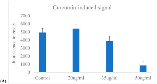 Figure 6A illustrates the GFP fluorescence intensity of CAFLUX HepG2/DREs-H2B-EGFP cells following exposure to varying concentrations of curcumin (Cur). The fluorescence signal remained relatively unchanged in the control and slightly increased at 20 µg/mL Cur. However, a concentration-dependent decrease in fluorescence was observed at higher doses, with a marked reduction at 35 µg/mL and a dramatic suppression at 50 µg/mL. This result indicates that higher concentrations of curcumin may inhibit the AhR signaling pathway, leading to downregulation of the GFP reporter gene controlled by the DRE promoter. Figure 6A reflects the GFP fluorescence response to Cur exposure, demonstrating that curcumin reduces GFP expression, which correlates with decreased CYP1A1 gene activity in HepG2 cells.