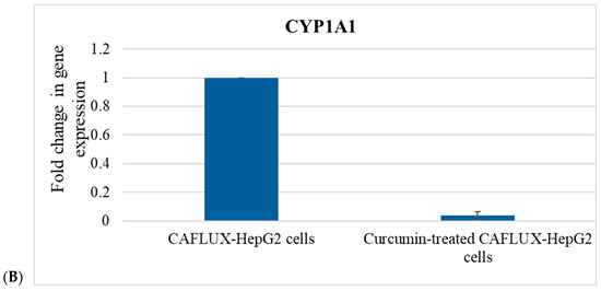 To assess the impact of curcumin on aryl hydrocarbon receptor (AhR)-mediated transcriptional activity, CYP1A1 mRNA levels were measured by real-time PCR in CAFLUX-HepG2 cells following treatment with 30 μg/mL curcumin for 24 h. As illustrated in Figure 6B, curcumin treatment resulted in a substantial decrease in CYP1A1 transcript levels compared to untreated controls.