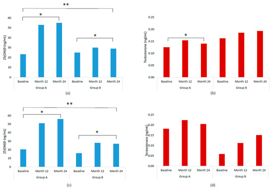 Serum 25(OH)D and testosterone levels (median) by treatment group and time point. (a) Serum 25(OH)D levels in total sample; (b) Serum testosterone levels in total sample; (c) Serum 25(OH)D levels in the subgroup without hormone suppressive therapy; (d) Serum testosterone levels in the subgroup without hormone suppressive therapy. * significance (p < 0.05) by Wald test for changes at 24 months (mixed model repeated measures—MMRM). ** significance (p < 0.05) by Likelihood Ratio Test for time changes between groups (MMRM for group/month interaction adjusted by month).
