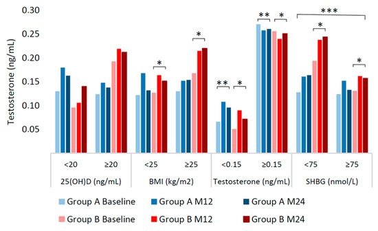 Median testosterone levels by treatment group over time, stratified by selected baseline variables. * Student’s t-test with the Satterthwaite method for changes at 24 months by strata within group B (mixed model repeated measures—MMRM). ** Student’s t-test with the Satterthwaite method for changes at 24 months by strata within group A (MMRM) *** Wald test by strata between groups on changes at 24 months (MMRM). Abbreviations: M12, month 12; M24, month 24.